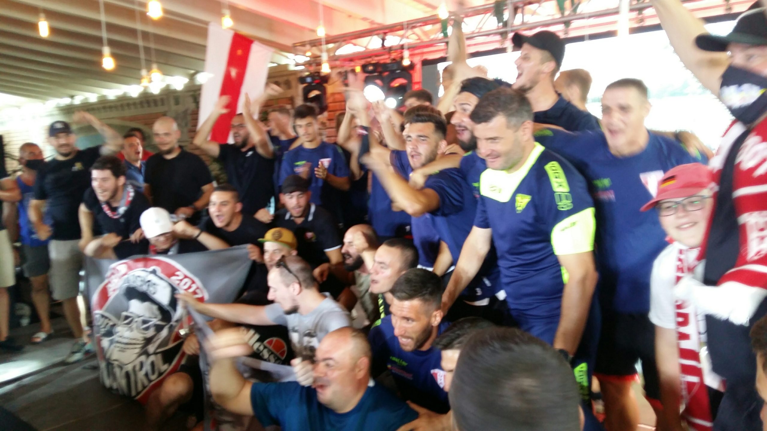 Apoi, suporterii s-au dezlănțuit, cântând, scandând și dansând în fața scenei de la „Marem”, acolo unde au fost prezentați campionii Ligii a II-a. „Nebunia” s-a declanșat la prezentarea trofeului, adus de Alexandru Meszar și predat antrenorului Laszlo Balint.