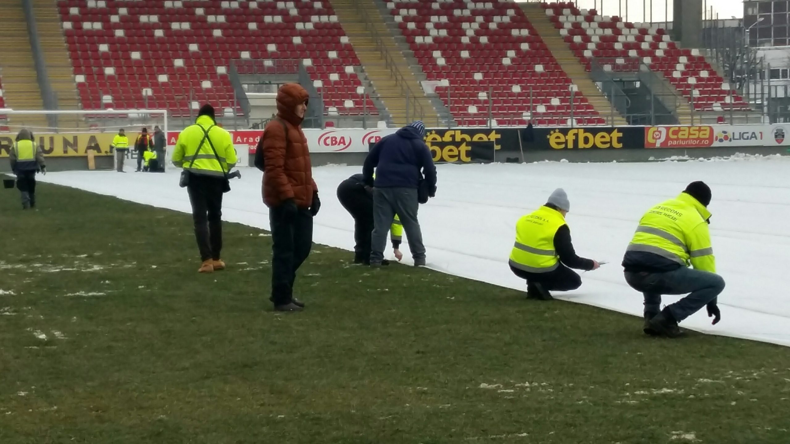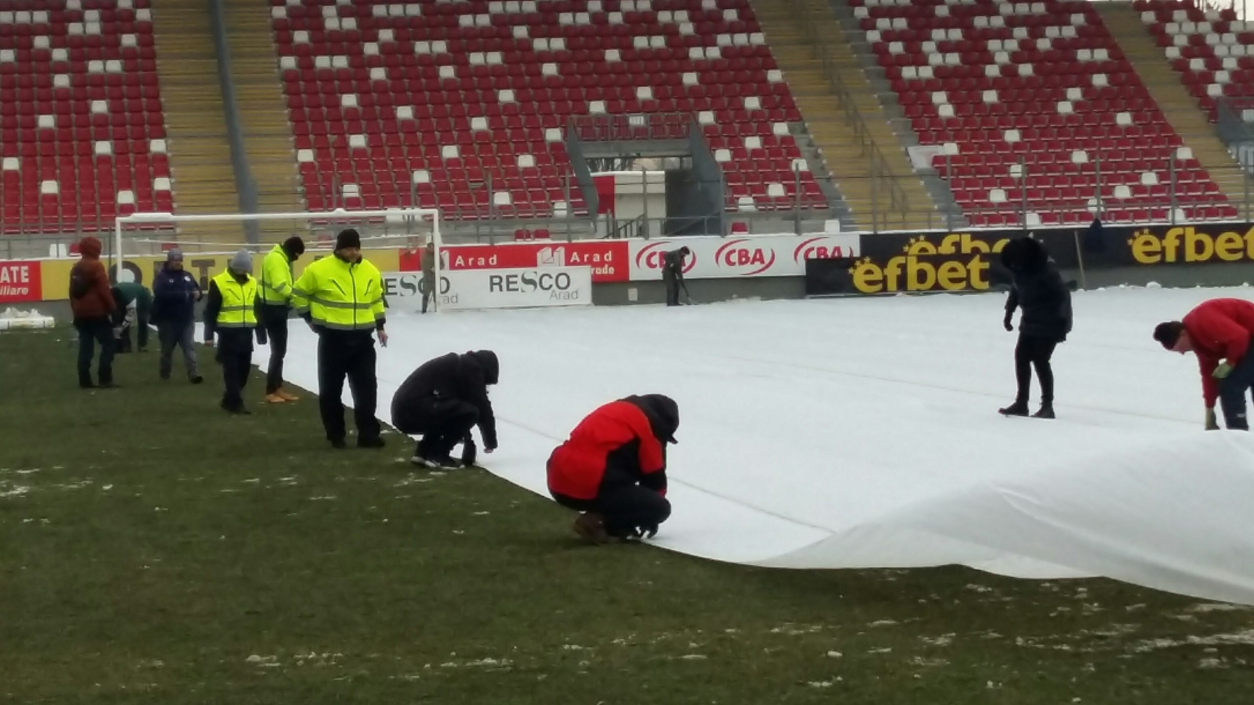Revenind la ceea ce se întâmplă chiar în aceste momente la stadion, am vorbit cu Monica Dascăl, de la Recons: „Gazonul este acoperit, chiar în aceste momente, cu o folie protectoare, care îl protejează de îngheț. Oricum, încă de miercuri, am dat drumul la degivrare, dar din cauza faptului că ea nu poate funcționa decât la 25% din capacitate, trebuie să-l acoperim, pentru a avea o temperatură constantă tot timpul. Degivrarea o tot mutăm la fiecare 8 sau 12 ore, în funcție de cât de frig e afară, nu e vina noastră că trasformatorul nu duce mai mult. Degivrarea va merge cât timp va fi nevoie. Avem peste 25 de oameni la stadion, în aceste momente, la începutul săptămânii au fost și peste 30. Ne dorim să facem totul cât mai bine, promitem ca meciul cu Gaz Metan să se desfășoare în cele mai bune condiții”.