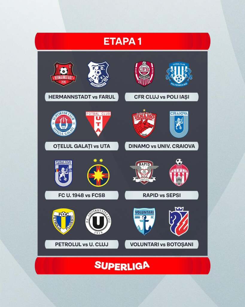 BUCUREȘTI. Țintarul noii ediții a Superligii a fost stabilit în această după-amiază la sediul Ligii Profesioniste de Fotbal. Au fost mai multe reguli pentru stabilirea programului, printre care cea că echipele angrenate în cupele europene nu se pot întâlni în primele 7 etape.